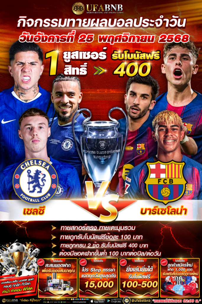 กิจกรรมทายผลฟุตบอล ระหว่าง เชลซี ⚽️ บาร์เซโลน่า ลุ้นรับโบนัสเครดิตฟรี 400 บาท (25/11/68)