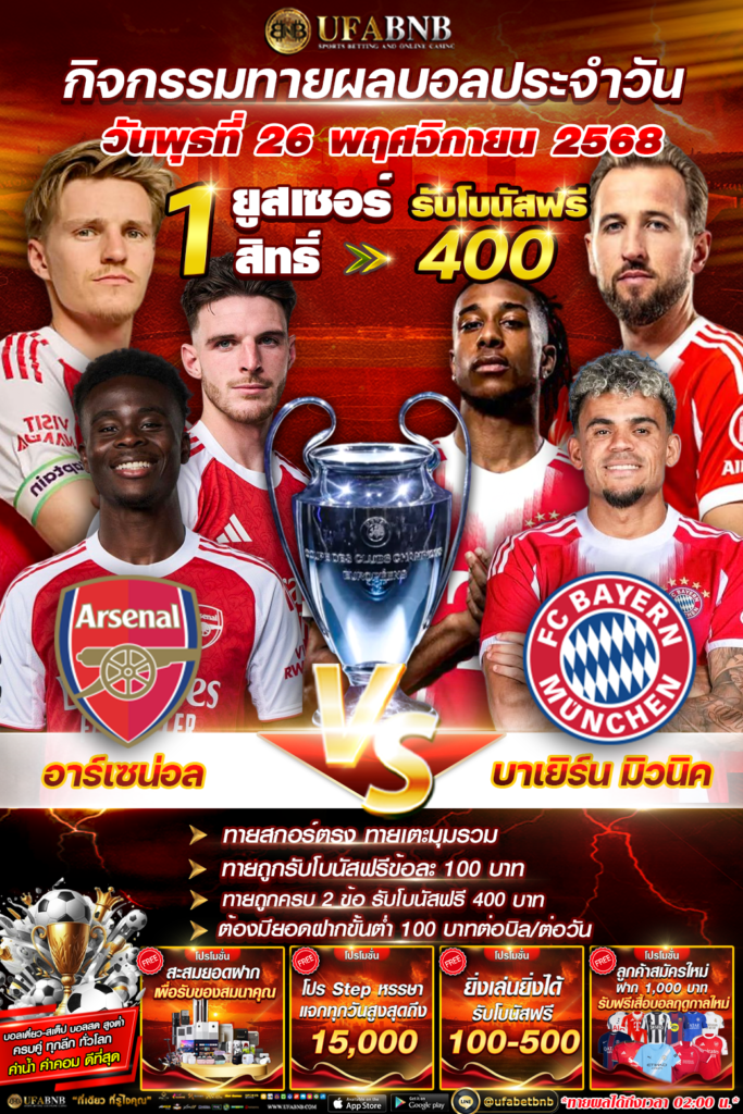 กิจกรรมทายผลฟุตบอล ระหว่าง อาร์เซน่อล ⚽️ บาเยิร์น มิวนิค ลุ้นรับโบนัสเครดิตฟรี 400 บาท (26/11/68)