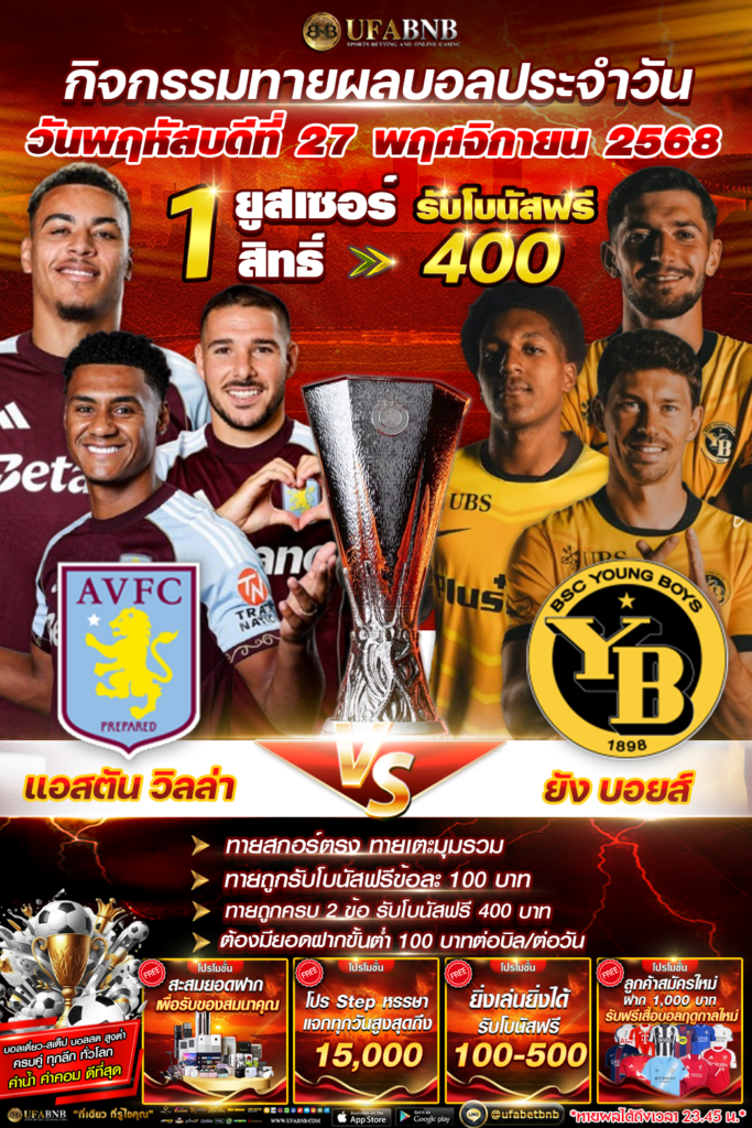 กิจกรรมทายผลฟุตบอล ระหว่าง แอสตัน วิลล่า ⚽️ ยัง บอยส์ ลุ้นรับโบนัสเครดิตฟรี 400 บาท (27/11/68)