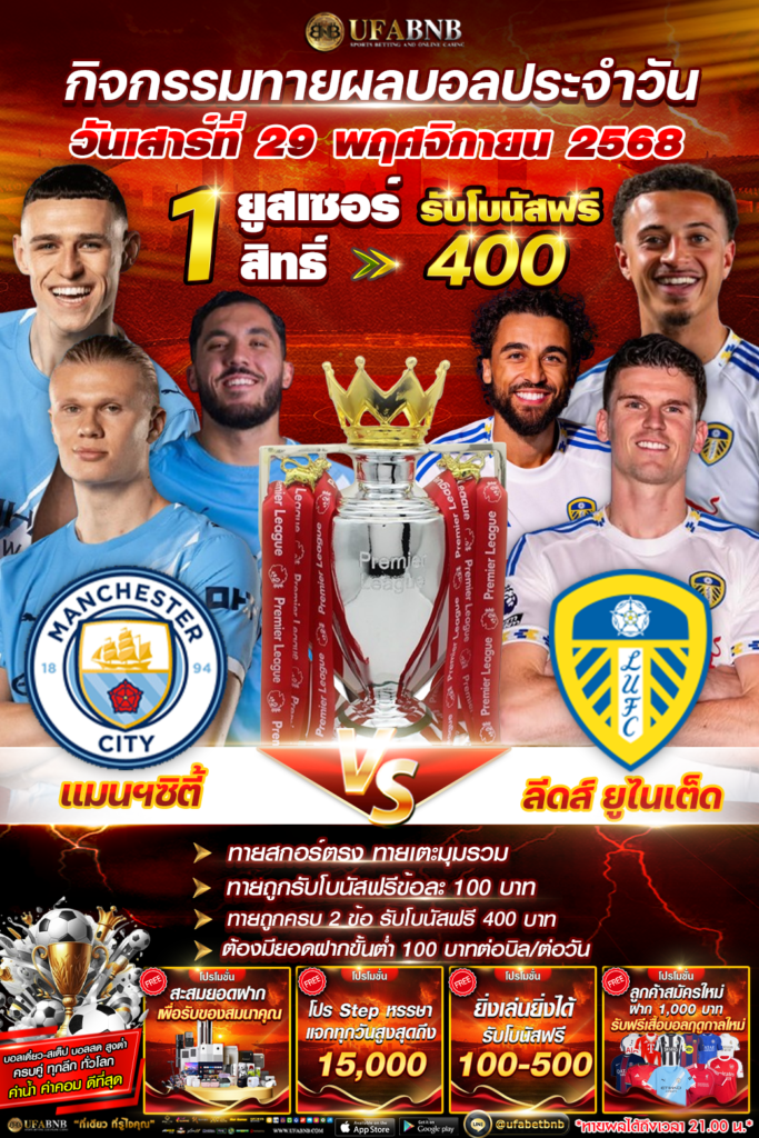 กิจกรรมทายผลฟุตบอล ระหว่าง แมนฯ ซิตี้ ⚽️ ลีดส์ ยูไนเต็ด ลุ้นรับโบนัสเครดิตฟรี 400 บาท (29/11/68)