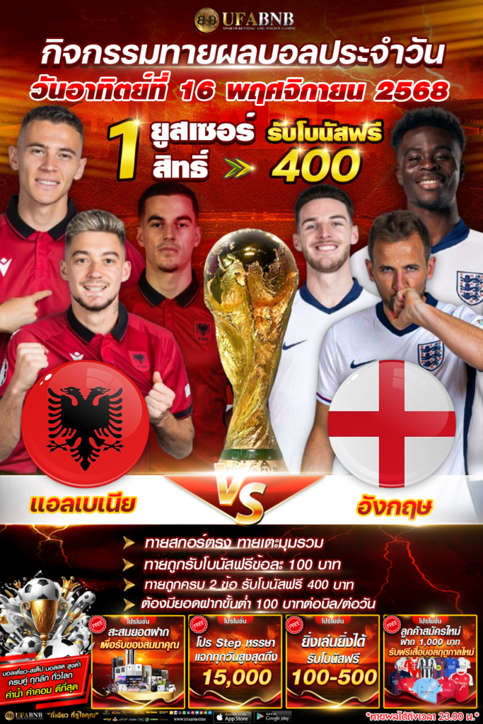 กิจกรรมทายผลฟุตบอล ระหว่าง แอลเบเนีย ⚽️ อังกฤษ ลุ้นรับโบนัสเครดิตฟรี 400 บาท (16/11/68)