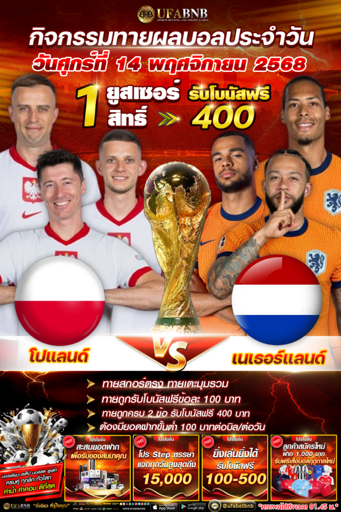 กิจกรรมทายผลฟุตบอล ระหว่าง โปแลนด์ ⚽️ เนเธอร์แลนด์ ลุ้นรับโบนัสเครดิตฟรี 400 บาท (14/11/68)