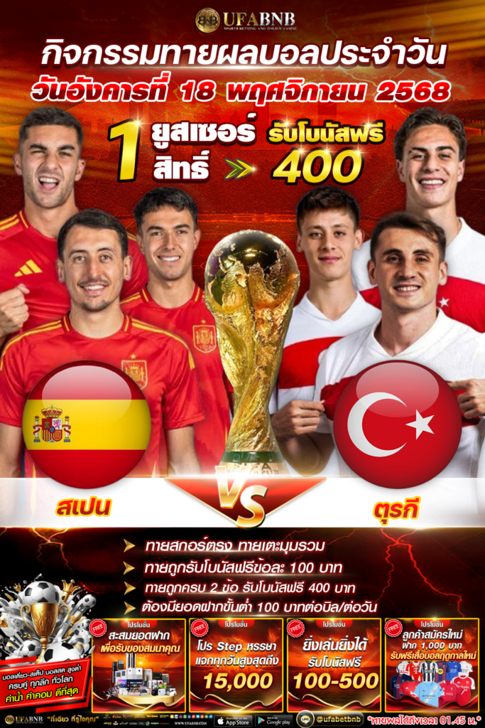 กิจกรรมทายผลฟุตบอล ระหว่าง สเปน ⚽️ ตุรกี ลุ้นรับโบนัสเครดิตฟรี 400 บาท (18/11/68)